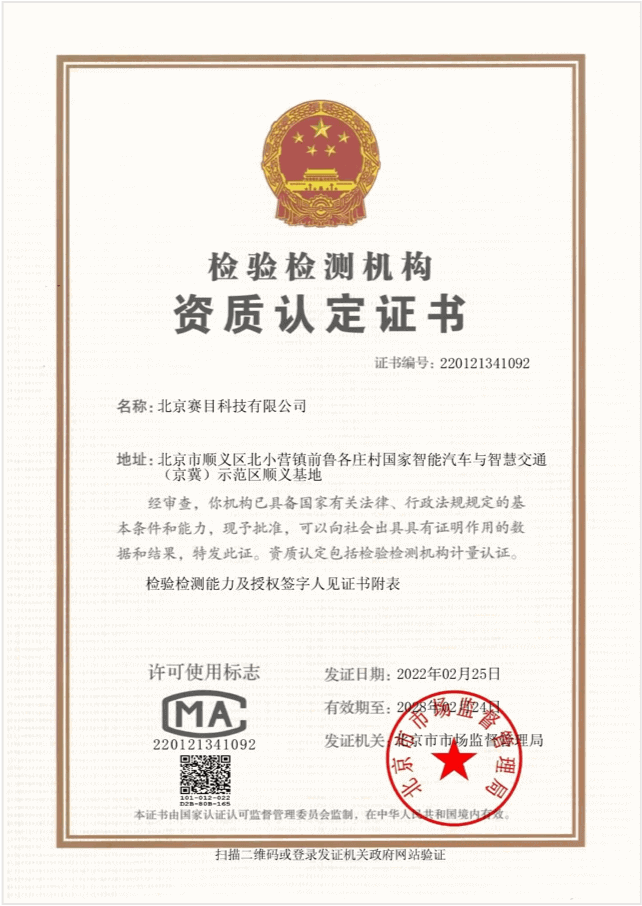 获得北京市市场监督管理局颁发的检验检测机构资质认定证书